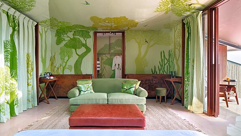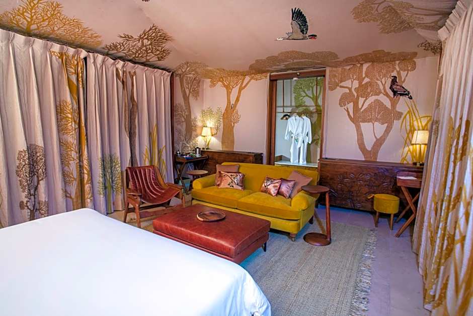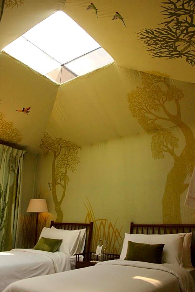 This family room features a balcony, soundproofing and seating area. This tent has an attached kids room with 2 beds for the kids connected through an interconnected door.